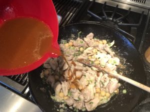 - Fourth step: Stir-fry scallions, garlic and hot pepper if you like it spicy. After a minute add in the chicken and stir-fry for another couple minutes before adding in the sauce, heat through until thickened. Add nuts, then stir to mix and pour over your cauliflower rice!