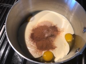 - First you will want to mix the eggs, condensed milk, sweetener, cloves, ginger, nut meg, cinnamon and salt in a saucepan over medium heat. Cook for about 5 minutes.