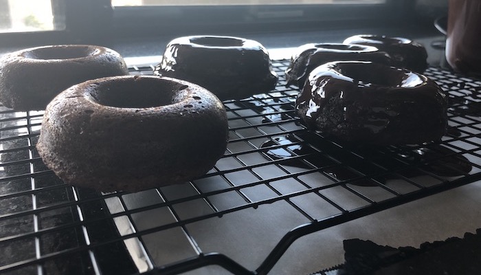 • Mix up the wet ingredients and in a separate bowl mix up the dry. Combine wet and dry, mixing well. Spoon mixture into your donut pan and bake at 350 for about 10-15 minutes.