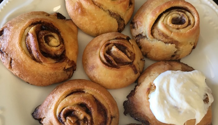 Heat the mozzarella with the cream cheese in microwave safe bowl 30 seconds then stir it up. Add the egg, flour and baking powder. Mix well. If it seems to need more almond flour add some to make it easier to work with. In the original recipe it says to cut 6 balls from the dough and roll them out. Fill it with the filling and roll it up, then cut each 6 in half to make 12 cinnamon rolls. I didn’t get that far so I made 7 big ones. Bake at 350F. for 15-20 minutes.