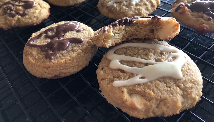 - I also added ChocZero white chocolate and milk chocolate on top just for fun. You will need to push down on these keto cookies and form them how ever thick or thin you want them. Be sure to let them cool completely before moving them to a plate or wire rack.