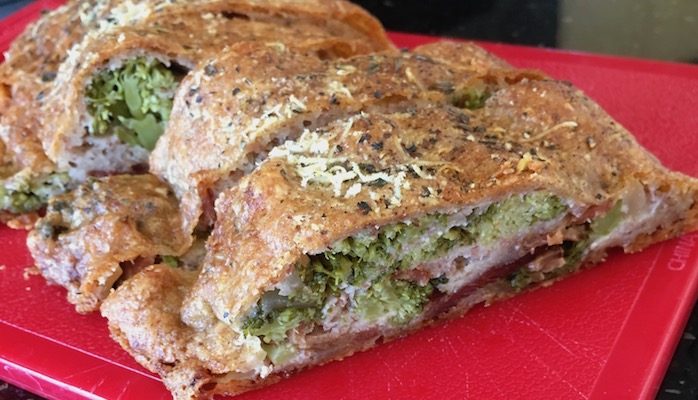 - To make the dough, heat the cheese and almond flour in a pan (you do not need a double boiler) to medium heat and stir until it forms a dough like substance, then place the dough on parchment paper, you will also need a piece for the top too. Then roll it out how you like. Add all your favorite ingredients. After you roll it up with all your favorite goodies, butter the top and add some spices that you like!