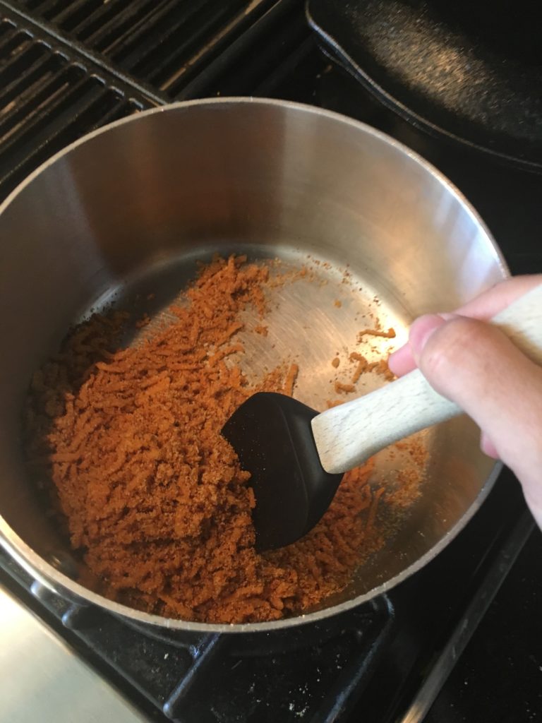 - In a small pot over low heat add the cocoa butter and coconut butter. Stir until melted. It's important that the oil is hot going into the bowl so that it all incorporates well. The mix should get a dough-like ball by the end.
