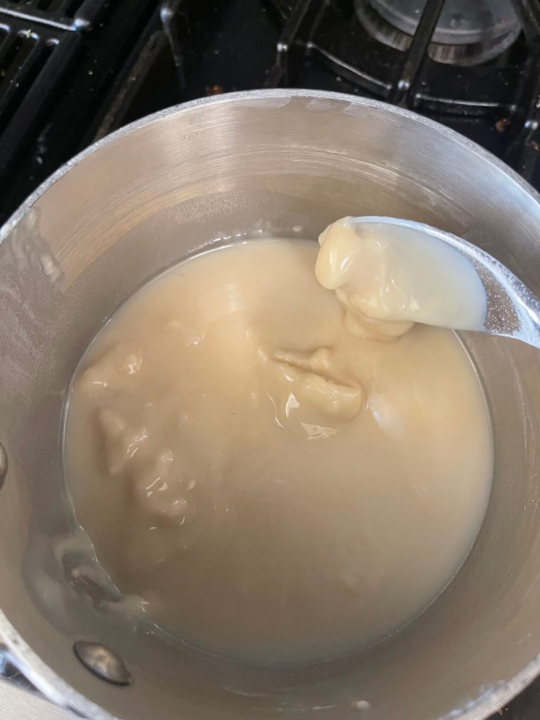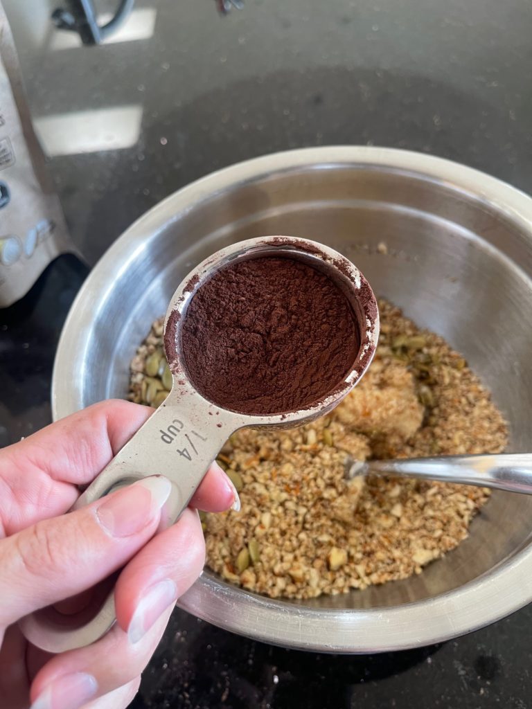 - In a small pot over low heat add the cocoa butter and coconut butter. Stir until melted. It's important that the oil is hot going into the bowl so that it all incorporates well. The mix should get a dough-like ball by the end.