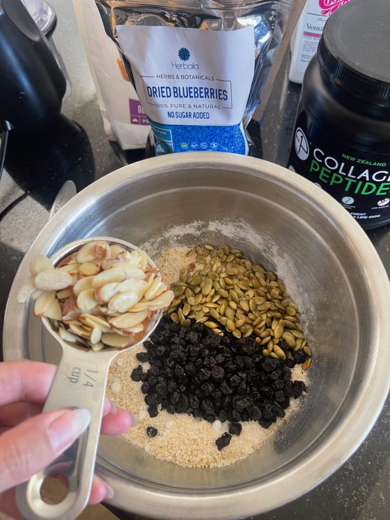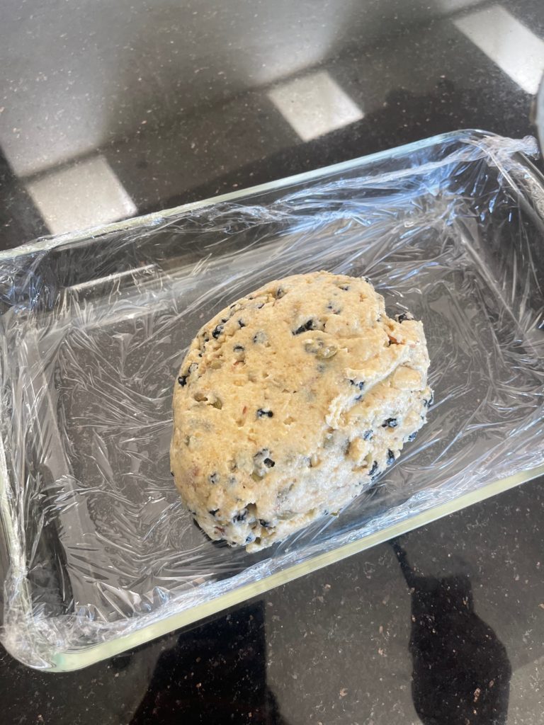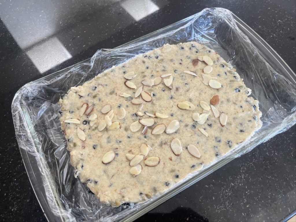 - Flatten out the dough ball with a spoon into a glass baking dish. Save some almonds for the topping because it's pretty. Almonds stick on top beautifully, you just need to use the spoon to smooth them over.
