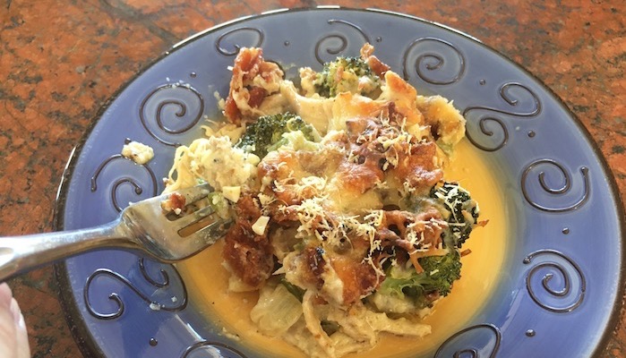 - For the sauce add the heavy cream, parmesan, cheddar cheese and arrowroot (thickener) to the chicken mixture. Pour the mixture evenly over the broccoli and rice.
