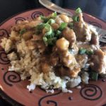Fourth step: Stir-fry scallions, garlic and hot pepper if you like it spicy. After a minute add in the chicken and stir-fry for another couple minutes before adding in the sauce, heat through until thickened. Add nuts, then stir to mix and pour over your cauliflower rice!