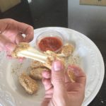 Whip up your eggs really good. You will start with putting your cut up mozzarella sticks in the blanched almond flour (or coconut flour) and get them coated and than take one at a time and put the cheese in the eggs to coat and lastly put in bread mixture and coat.